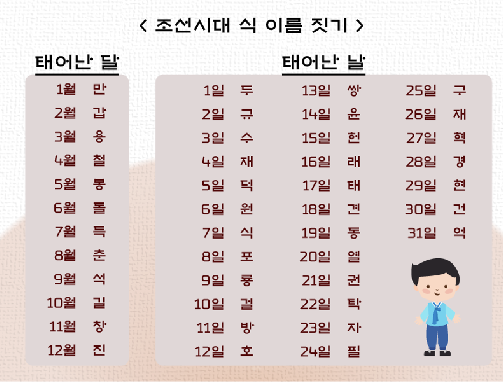 조선시대 신분을 만들기 위해 보기를 활용하여 이름을 정하고 룰렛을 통해 직업을 만드는 체험